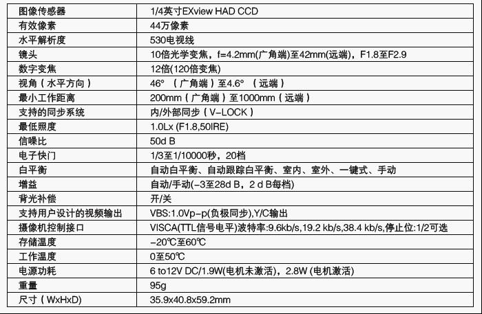 FCB-EX11DP 摄像机模块装有一个 10 倍光学变焦镜头,与12 倍数字变焦共同使用时,即具有了 120 倍变焦能力。