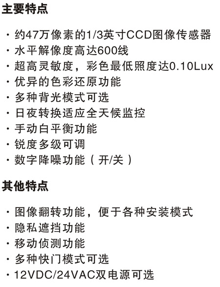 首页 >  枪式摄像机系列 >> VCC-4688PC 1/3"彩色CCD DSP高解像度昼/夜摄像机