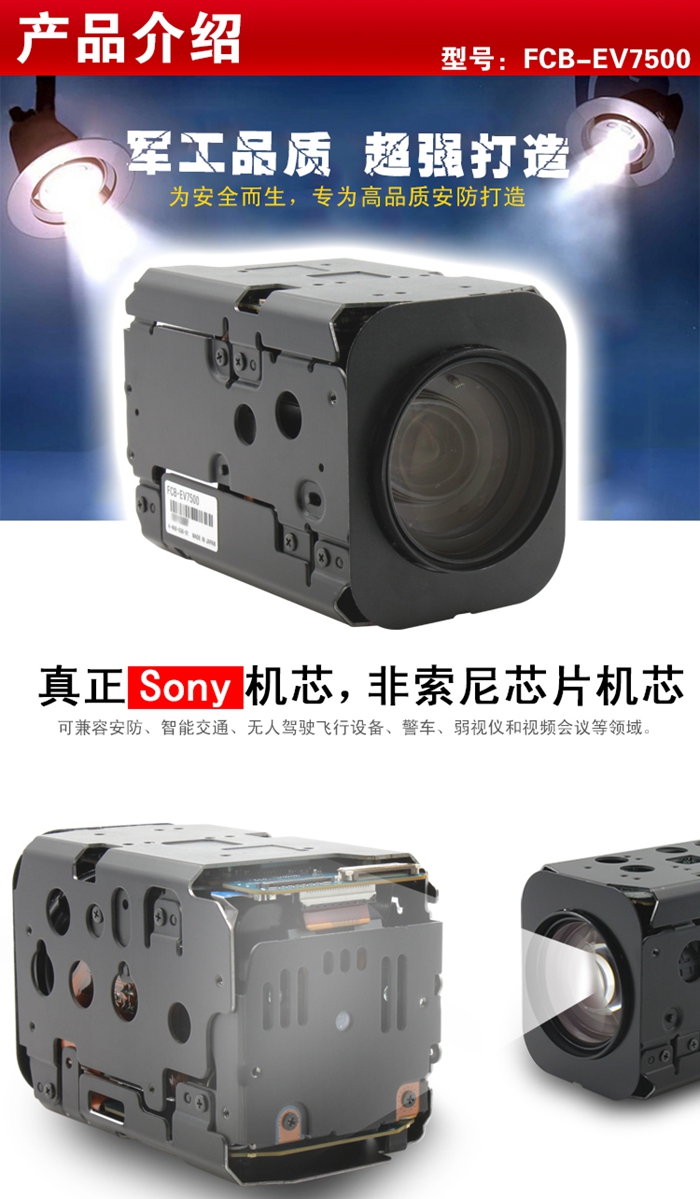 索尼,高清(HD)技术的领军企业,目前,又推出了一款新型高清摄像机组件FCB-CV7500,使得 FCB 摄像机组件系列进一步发展壮大。为了满足全高清格式才能提供的高质量、高分辨率画面的需求,索尼特别推出一款30 倍光学变焦镜头组件,可应用在安防、智能交通、无人驾驶飞行设备、快照亭、警车、弱视仪和视频会议等领域。旗舰型号 FCB-CV7500 摄像机组件搭载了一个支持全高清分辨率1080p60的 1/2.8 英寸 Exmor™ CMOS 成像器,30 倍光学变焦镜头能实现优异的变焦性能,并增加了全新超宽动态功能与图像透雾功能。