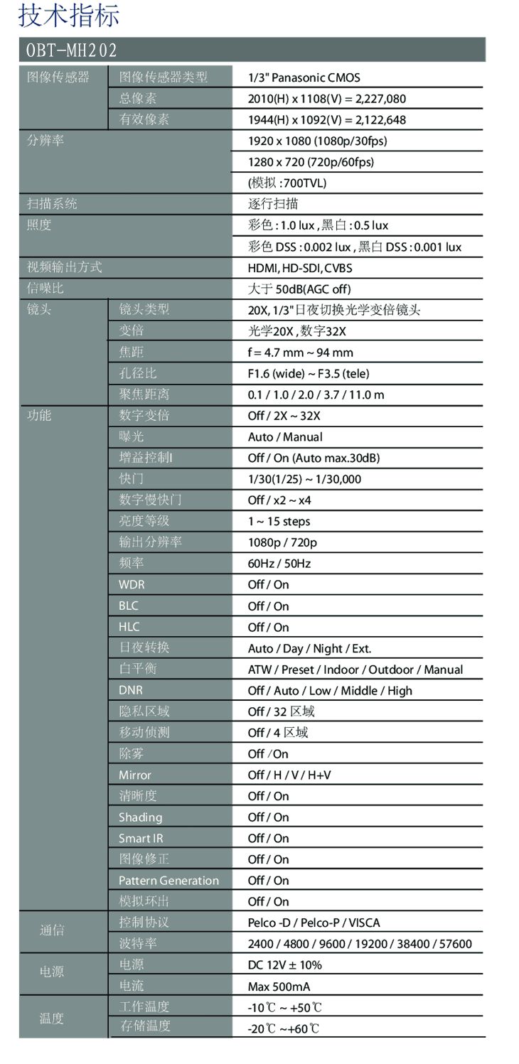 • 1/3" Panasonic CMOS 图像传感器 • 2,227,080像素(总像素)/2,122,848像素(有效像素) • 20x光学变倍 • 全高清分辨率 1920x1080p/30fps,1280x720p/60fps • 日夜切换(ICR) • WDR(超级宽动态) • DNR(数字降噪,2D+3D) • 隐私遮挡 • 移动侦测 • 除雾功能 • HLC(高亮度补偿) • 协议(VISCA,Pelco-D,Pelco-P)