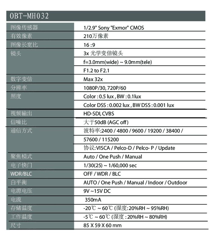 • 1/2.9" Sony “Exmor”CMOS 图像传感器 • 全像素扫描:1920(H)X1200(V),230万像素 • 3x光学变倍(3mm~9mm) • 高清输出分辨率:1920x1080p@30fps/1280x720p@60fps • ICR红外滤片式自动日夜切换 • 支持2D/3D数字降噪,宽动态,强光抑制,移动侦测,隐私遮蔽,除雾功能 • HD-SDI/CVBS输出