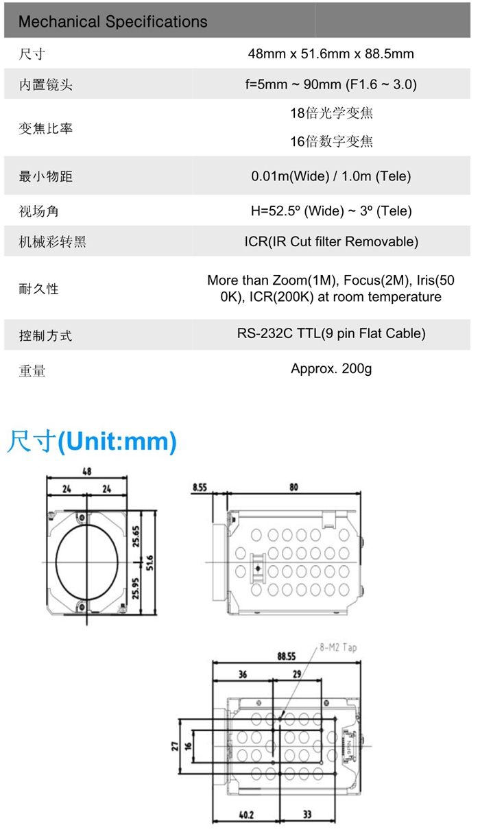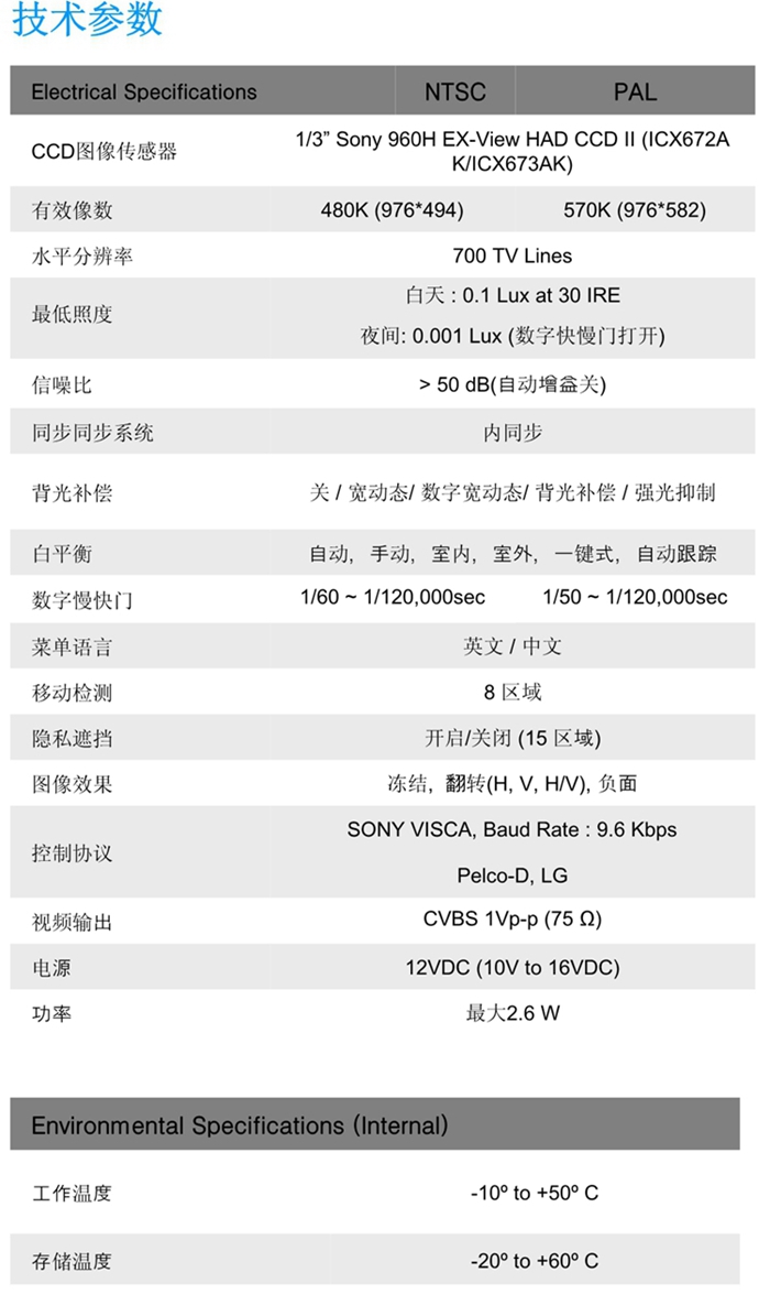 ■ 1/3” SONY 960H EX-View HAD CCD II ■ 18倍光学变焦(16倍数字变焦) ■ 机械彩转黑 ■ 数字宽动态 ■ 3D数字降噪, 除雾 ■ 隐私遮挡 ■ 智能感红外 ■ 兼容 SONY, Pelco, LG多种控制协议 ■ RS-232C (9 Pin Flat Cable)