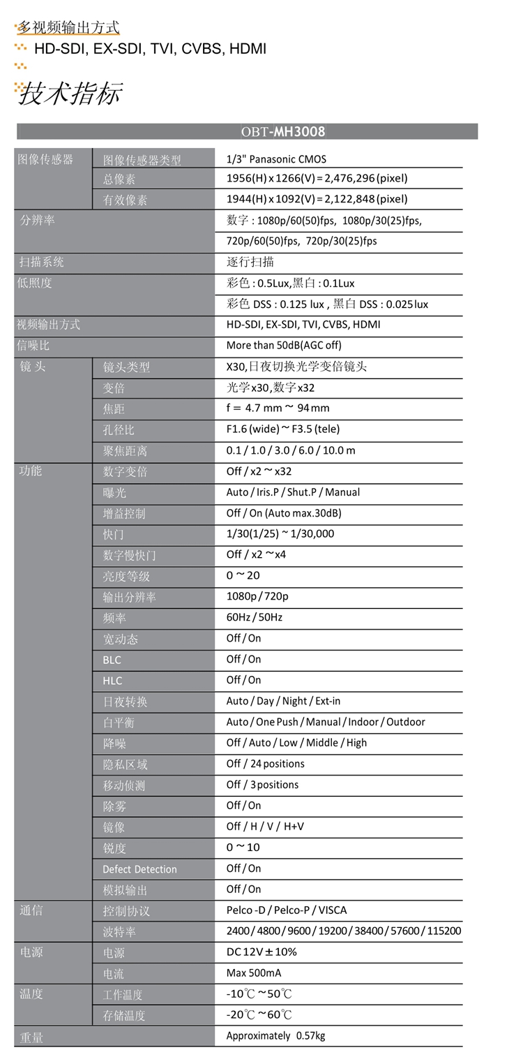 • 1/3" 2MP 60fps Panasonic CMOS 图像传感器