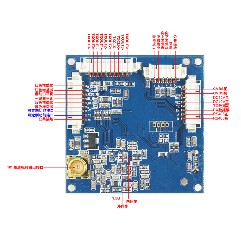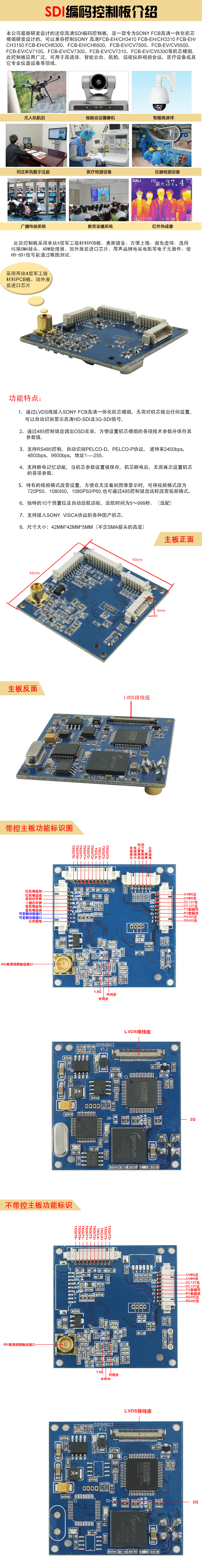 迷你高清3G-SDI编码控制板,专为SONY FCB数字高清机芯模组研发设计,迷你SMA射频接口,通过LVDS接口连接编码板,输出3G-SDI视频信号