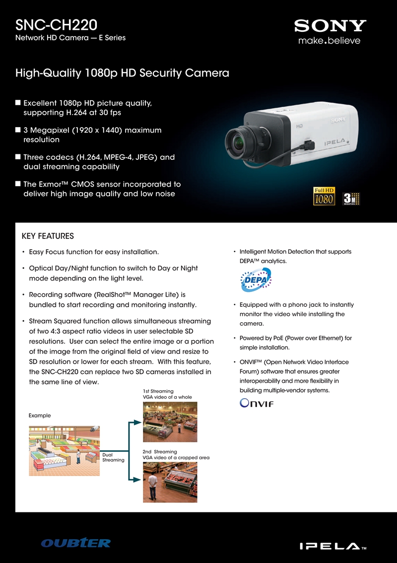 SNC-CH220 是一款室内高清(1080p、支持 H.264@30fps)300 万像素(1920 x 1440 最大分辨率)固定摄像机,具有机械式日夜转换功能、DEPA 智能和 ONVIF 标准合规性。支持双流媒体和三重编解码器编码。索尼 Exmor CMOS 传感器的出色画质和事件检测功能可用于收集有效证据。