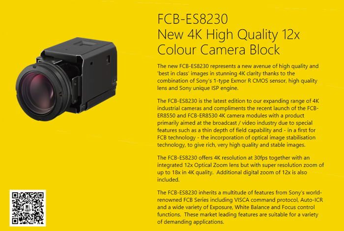 SONY的FCB-CS8230 已经是SONY最新一代大靶面的4K超高清数字一体化摄像机,具有先进电子透雾、高动态的宽动态功能,能应对复杂外部环境。同时具有高亮点抑制功能,因FCB-CS8230选用1英寸的CMOS,超大的感光面积,能在室内低照度环境下承现更小的噪声,更鲜艳的色彩,更有层次感的画面, 具备广播级质量的 4K 图像是高端会议摄像机,医疗设备所需4K超高清摄像机的必选产品。
