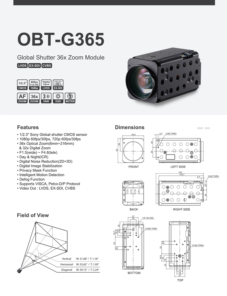 首页 >  长焦高清一体化机芯 >> OBT-G365 36倍光学全局曝光一体化数字摄像机机芯 1080P/60分辨率