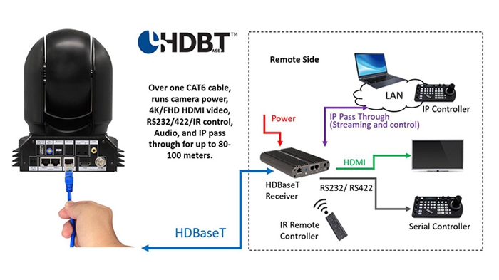 支持, 通过一根CAT6网线,可传输摄像机电源,4K / FHD HDMI视频,RS232 / 422 / 485 / IR控制,音频和IP。传输距离高达80-100米。