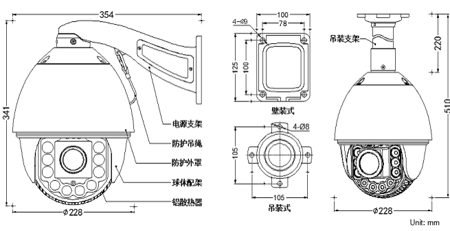 ■采用铝合金球型外壳设计, 部件结构紧凑,外壳防护强度高,散热性能优良。云台下半球外露式设计,红外灯采用外露式外壳体散热,有效解决解码板,红外灯等部件的高温老化效应。