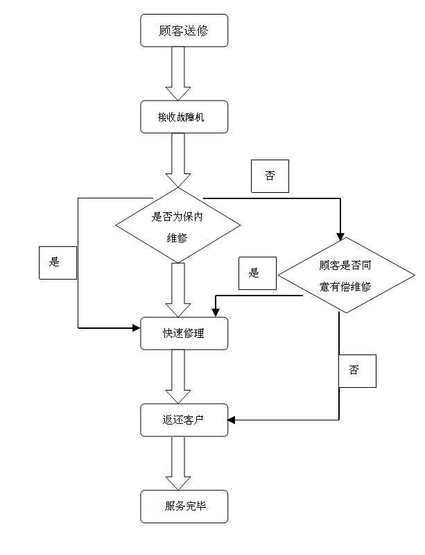 1.接收顾客维修信息时,及时录入维修登记表; 2.判断为保外维修时,明确告知顾客原因及维修费用; 3.客户维修机的维修周期原则上两周完成,特殊情况须上报备案并及时通知客户; 4.暂无配件时,告知预计修复时间; 5.排出保修故障后,全面检测顾客机器确保没有其他故障; 6.告知顾客修理内容及使用注意事项;